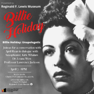 Billie Holiday lived her life unapologetic. On April 7th the Reginald F. Lewis Museum will celebrate the jazz legend on her birthday with a conversation hosted by White House Correspondent April Ryan. In dialogue with Dr. Leana Wen, Saxophonist, Kirk Whalum and Professor Lawrence Jackson of Johns Hopkins University who founded the Billie Holiday Project for Liberation Arts.