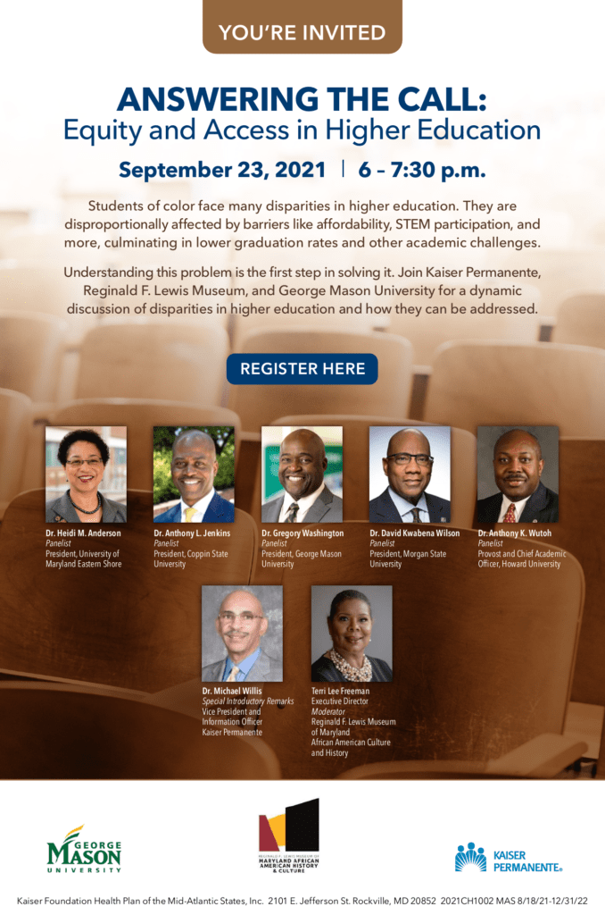 Students of color face many disparities in higher education. They are disproportionately affected by barriers like affordability, STEM participation, and more, culminating in lower graduation rates and other academic challenges. Understanding this problem is the first step in solving it. Join Kaiser Permanente, Reginald F. Lewis Museum, and George Mason University for a dynamic discussion of disparities in higher education and how they can be addressed.