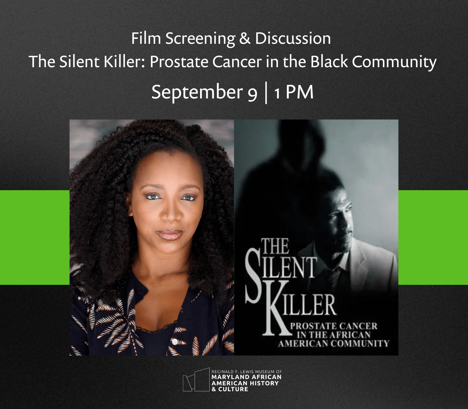September is National Prostate Health Month. Health statistics reveal that 1 in 6 African American will struggle with prostate cancer – a rate higher than any other group. Join The Reginald F. Lewis Museum and ZERO Prostate Cancer for a documentary screening of The Silent Killer: Prostate Cancer in the Black Community. Following the film screening there will be a panel discussion featuring the filmmaker Landi Maduro, Eric Morrow, a prostate cancer survivor, Dr. Sherrie Wallington, health disparities researcher specializing in oncology in the Policy, Populations and Systems department and Kris Bennett of ZERO Prostate will moderate the discussion. The panel will talk about the film, how prostate cancer impacts the Black community, and provide suggestions to address barriers to treatment and care. Questions from the audience  will be taken during a Q & A. Light refreshments will be provided.