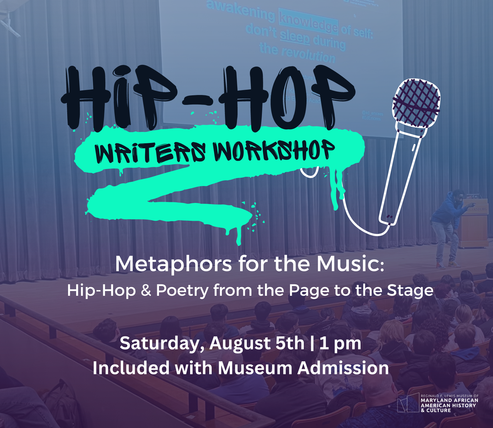 The celebration of the 50th Anniversary of Hip Hop continues as you Rap to your own beats by participating in a workshop for youth and adults. Join Ed Emcee Academy in this writing and performance workshop exploring the evolution of hip hop culture from the late 80’s to early 2000, with a specific focus on influential poets, rappers, spoken word artists and emcees. The Ed Emcee Academy team will discuss the relationship between written and spoken words, rhythm, lyricism, beat, flow, and rhyme in hip hop music. This workshop includes a creative writing activity followed by an open mic experience for the audience to share their works.