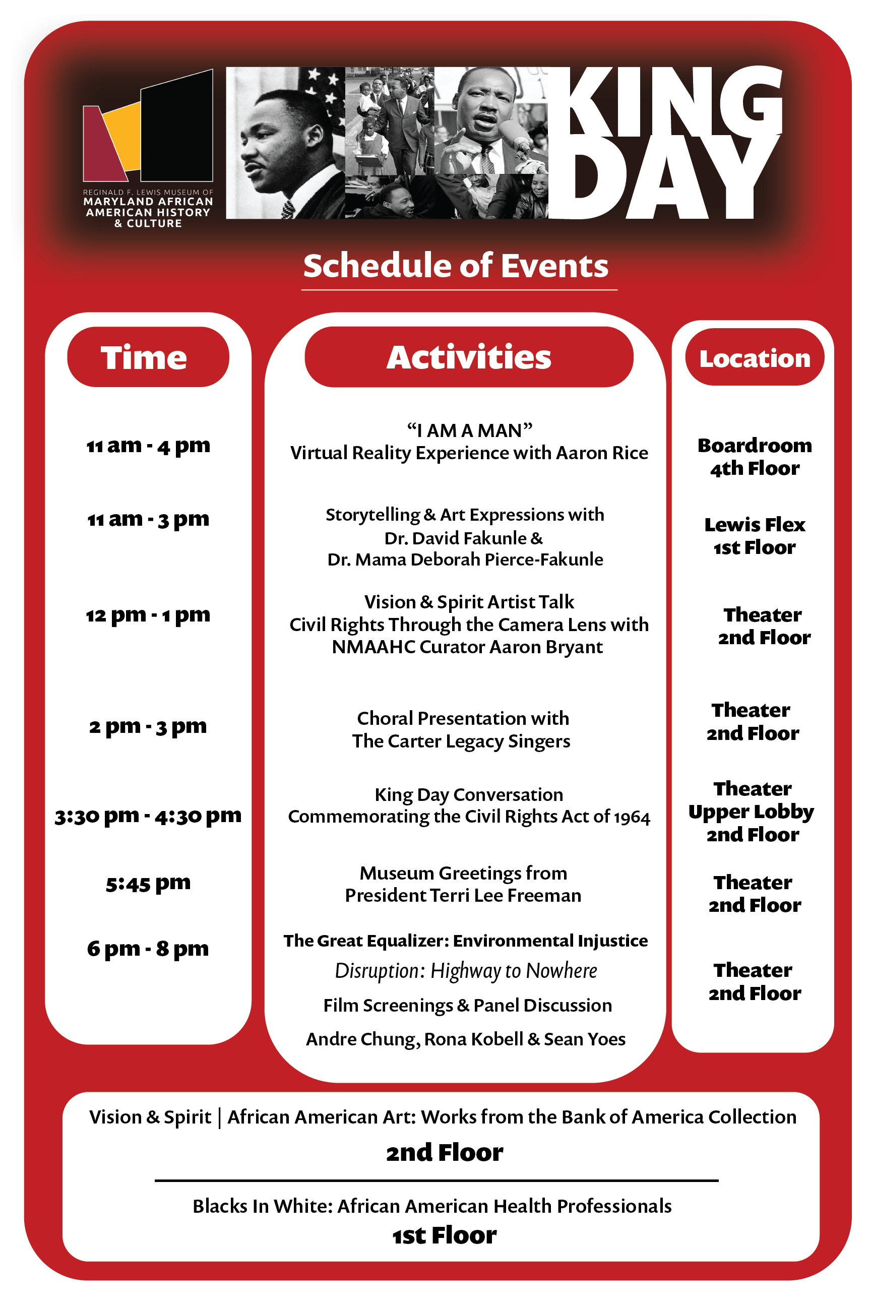 Celebrating Dr. King and Maryland’s Year of Civil Rights through music, art, storytelling and virtual reality in connection as we close the exhibition, Vision & Spirit | African American Art: Works from the Bank of America Collection. Enjoy an artist talk with NMAAHC Curator Aaron Bryant on civil rights photojournalists who documented Dr. King and other landmark moments from this era. Reflect on the movement with a choral performance from the Carter Legacy Singers, a community-based ensemble comprised of Dr. Nathan Carter’s alumni singers from Morgan State University. Families can learn more about the Montgomery Bus Boycott through mother-and-son storytellers, “Dr. Mama” Deborah Pierce-Fakunle and Dr. David Fakunle. Participate in an I Am A Man virtual reality experience to explore the Memphis Sanitation Workers protests and their aftermath. Hear a panel discussion reflecting on Dr. King and pivotal moments in the passage of the 1964 Civil Rights Act of 1964 by Maryland community civil rights leaders. Participants include: Rev. Dr. Ruby Reese Moone, Charles Mason, Leo Burroughs Jr., Lisa Mitchell Sennaar and Simone R. Barrett (Moderator). July 2, 1964 marks the 60th anniversary of the Civil Rights Act of 1964.