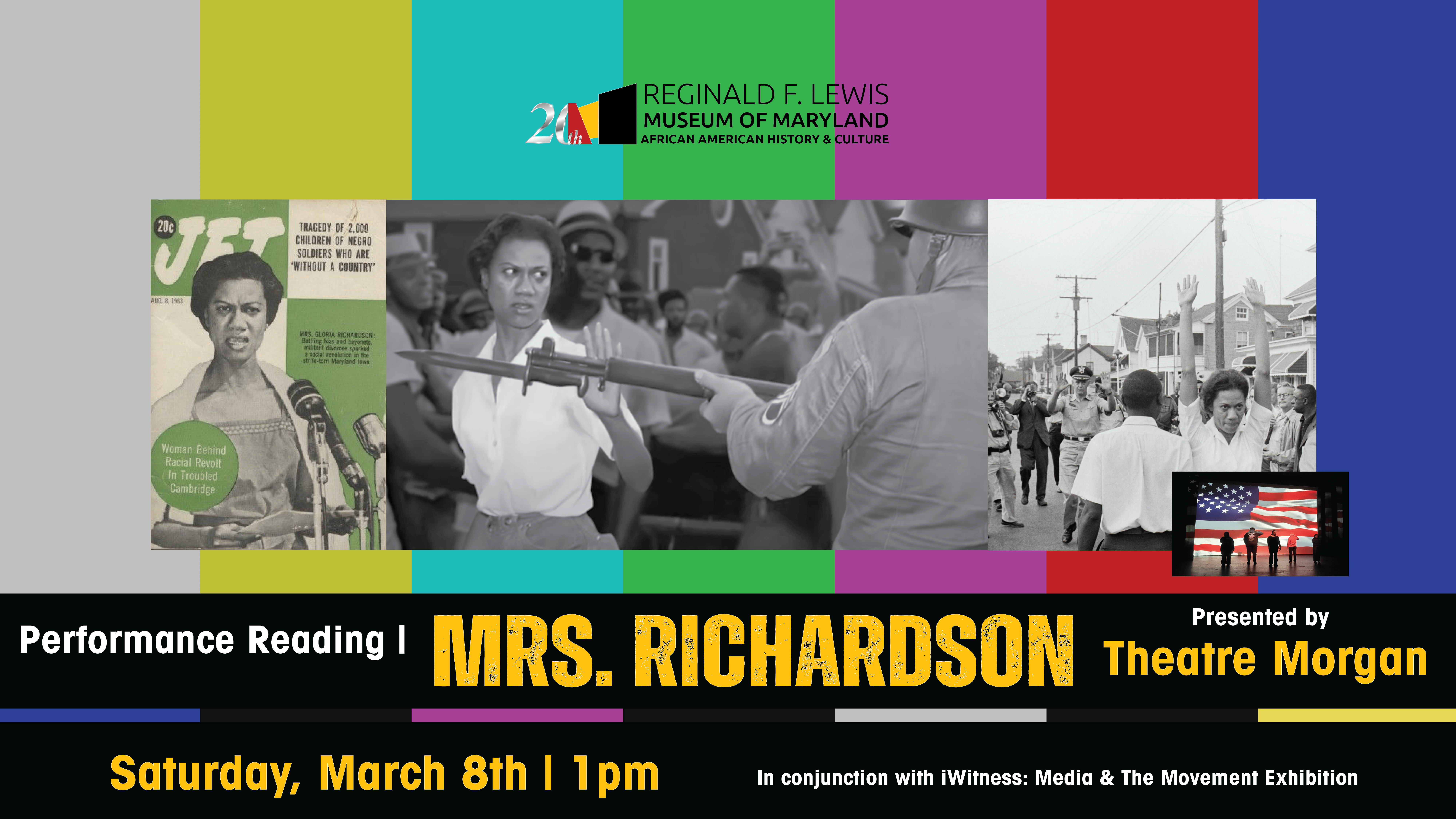 Celebrate Women’s History Month  through a performance reading of Mrs. Richardson written by playwright historian Dr. Peter Levy and presented by Theatre Morgan students of Morgan State University.  In less than three years, she helped build one of the most vibrant local movements in the nation, compelled the Kennedy administration to negotiate an unprecedented treaty agreement, which provided jobs, housing, and desegregated public accommodations, and established a collaborative project with Malcolm X.  Richardson was also one of seven “Negro Women Fighters for Freedom” officially recognized and seated on the stage of the 1963 March on Washington.