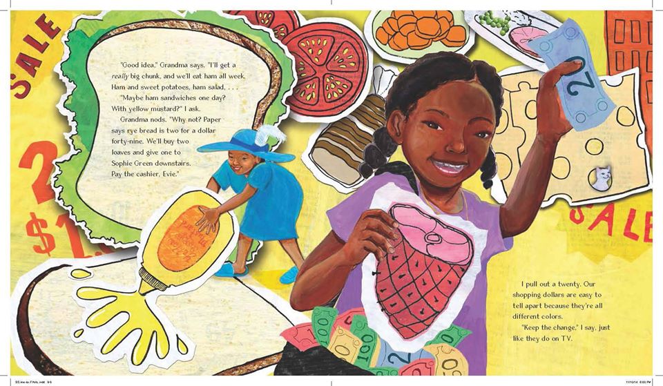 Sunday nights are special for Evie and Grandma. That’s when they go on their weekly shopping spree. Grandma flips open the newspaper to see what’s advertised, and the imaginary tour of neighborhood stores begins.