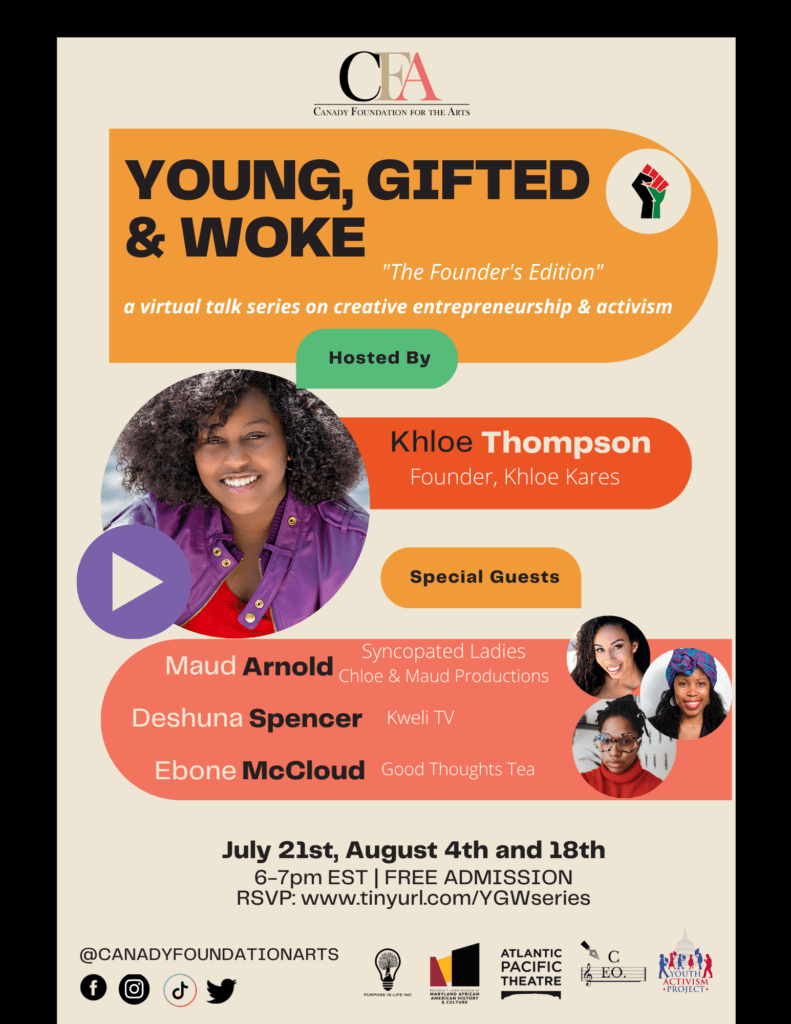 Hosted by 13 year old artist activist, Khloe Thompson, Young, Gifted & Woke Talk Series, is a conversation series with artists and activists working to better the world through creativity and activism in the community. Premieres July 21st!  This program is in partnership with the Canady Foundation for the Arts. This  event series exposes the public and international youth to the power art and artists have to change the world.