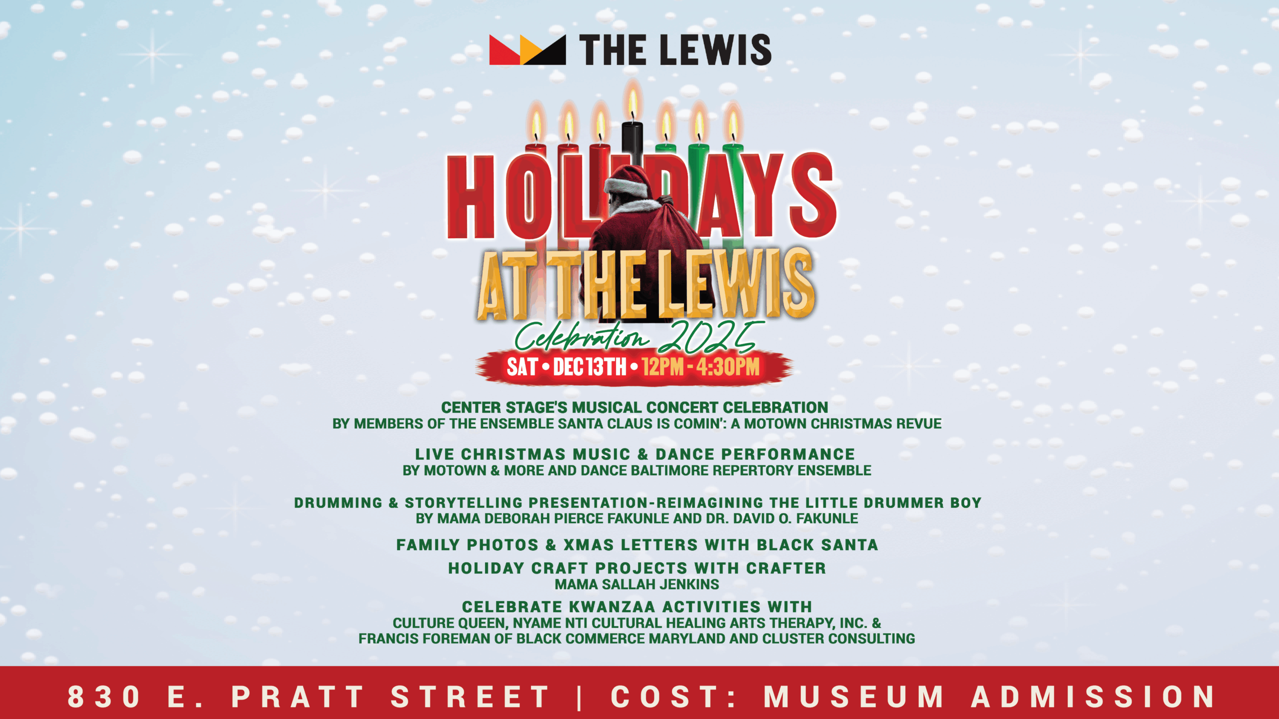 Saturday, December 13 | 12:00pm - 4:30pm | Museum Admission Join the Reginald F. Lewis Museum and bring in the season of Christmas and Kwanzaa with soulful melodies and a little holiday funk. The Baltimore Center Stage will present sample tunes from Santa Claus Is Comin’, a dazzling, family-friendly musical concert celebration by Nygel D. […]
