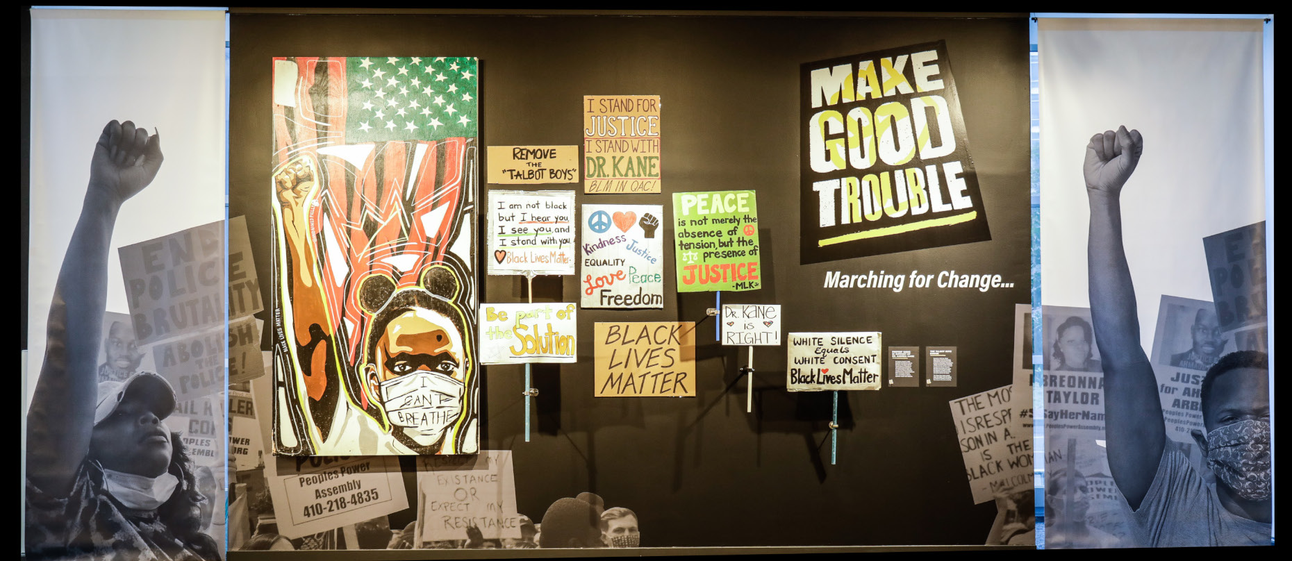“Make Good Trouble: Marching for Change” The exhibition tells the stories of Maryland artists and citizen protestors who took to the street to rise awareness about social injustices in the wake of George Floyd’s death. Just as the photo of Emmett Till’s mangles body in the pages of Jet magazine in 1955 propelled the Civil Rights Movements, the video of George Floyd gasping for air and calling for his mother, along with the deaths of Ahmaud Arbery and Breonna Taylor, sparked another movement. From small American towns to major international cities, citizens took to the streets with masks on and fists raises to call for an end to systemic racism. Reminiscent of the 1995 Million Man March, the recent Black Lives Matter protests call for action to address the economic and social issues that have adversely affected Black people for centuries.