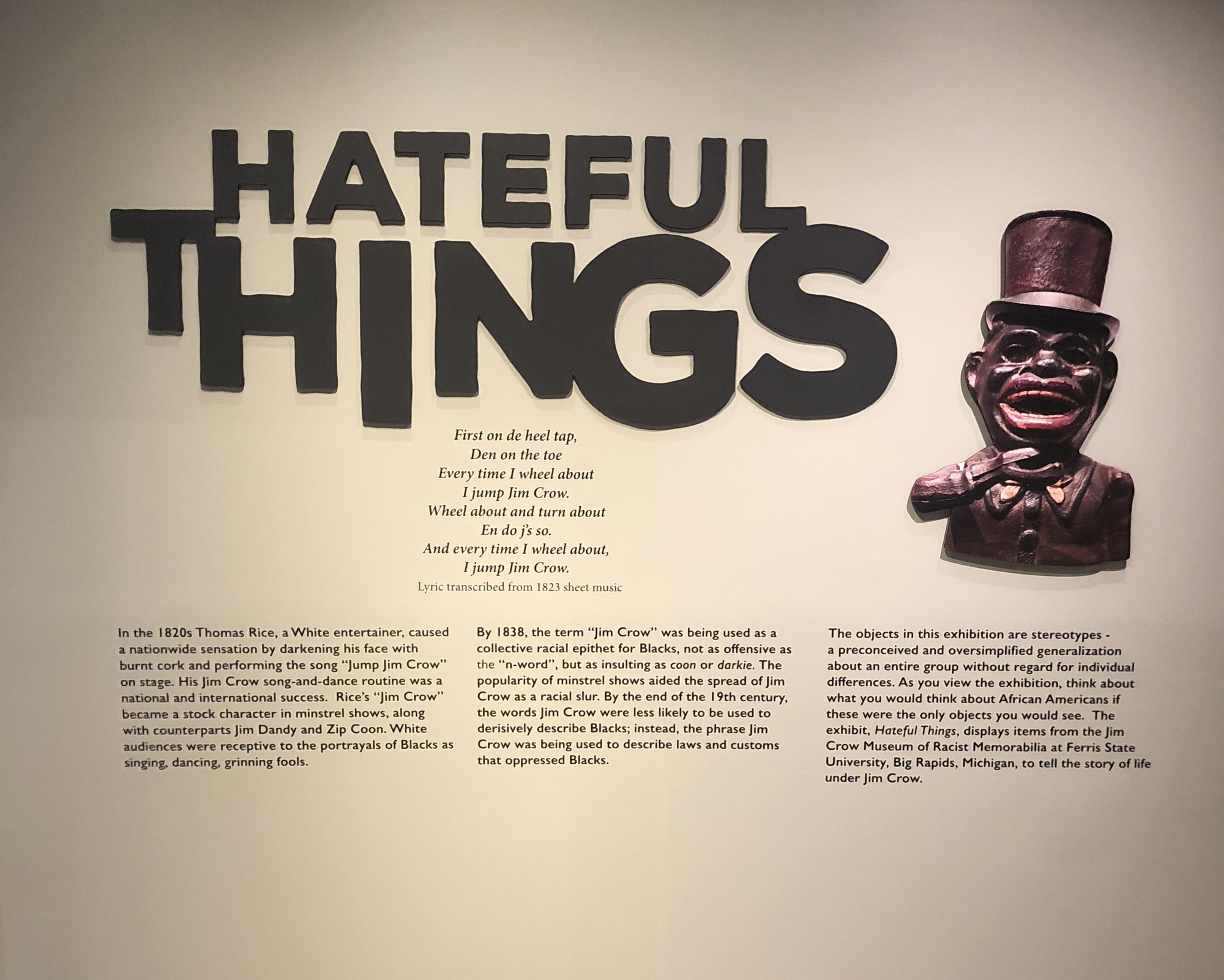 Contained material culture from the late 19th century to the present, embodying the terrible effects of the Jim Crow legacy. In the early 1830s Thomas D. Rice created the antebellum character Jim Crow. “Daddy Rice,” as he was called, was a white actor who performed in black face a song-and-dance whose exaggerations popularized racially demeaning minstrel shows. The name “Jim Crow” came to denote segregation in the 19th century when southern and border states passed Jim Crow laws; legitimizing a racial caste system. This exhibition contains examples of our segregated and racist past.