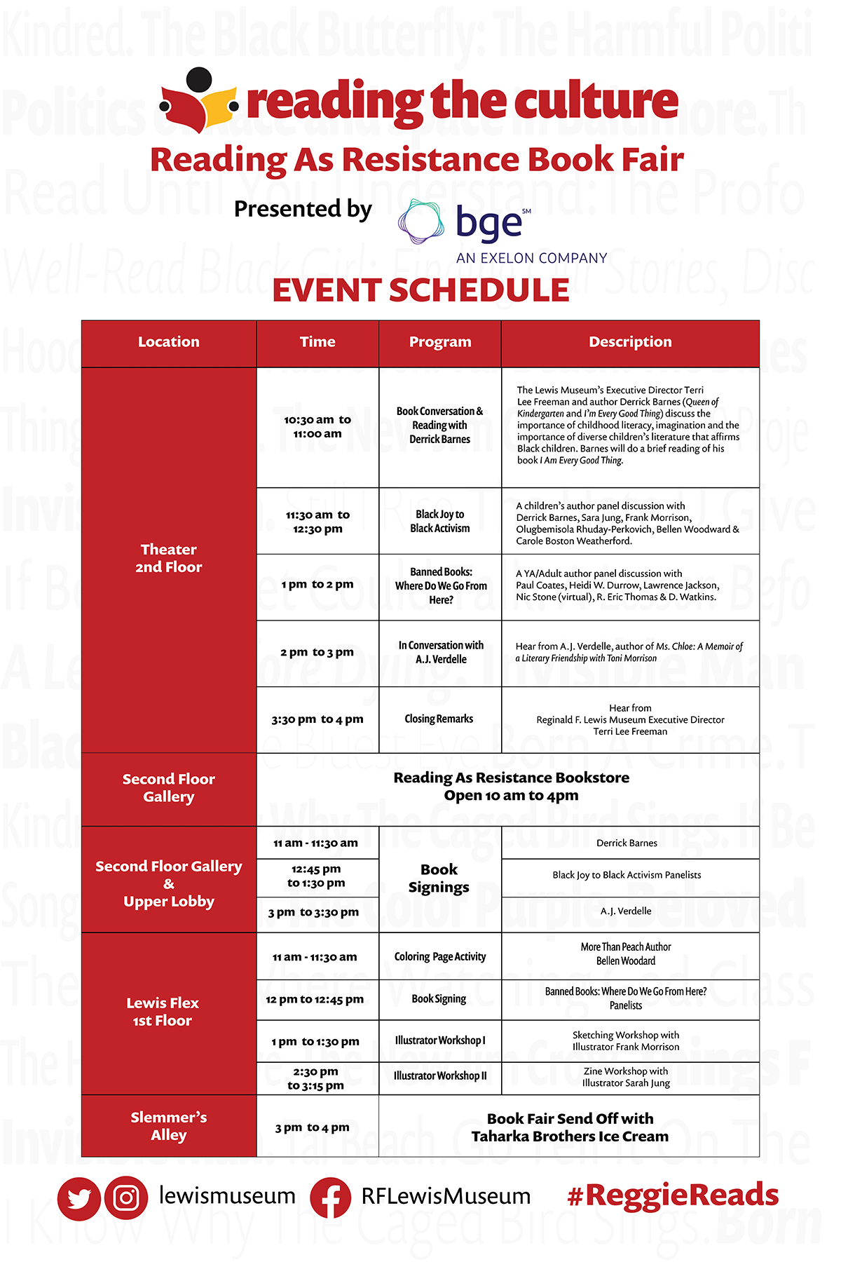 BALTIMORE, Md. (September 23, 2022) – The Reginald F. Lewis Museum of Maryland African American History and Culture (The Lewis Museum) will celebrate the importance of books and literature with two events continuing its Reading The Culture theme for the fall. On Saturday, September 24th, from 10 am to 4 pm, The Lewis Museum will host its Reading The Culture Reading As Resistance Book Fair. This Lewis Museum favorite with a twist will highlight the writings of Black, Indigenous, Latinx, Asian, and LGBTQ+ authors who are most likely to be banned and censored. The day includes panel discussions and signings with leading authors from the children’s book, young adult literature, and adult fiction and non-fiction genres. The Reading as Resistance Book Fair is made possible through the generous support of BGE.